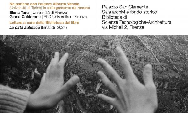 "La città autistica" di Alberto Vanolo, che si terrà mercoledì 12 novembre dalle 9,00 alle 11,00 a Palazzo San Clemente a Firenze all'interno del ciclo delle Archistorie della Biblioteca di Scienze Tecnologiche. La presentazione è anche l'evento conclusivo del seminario tematico "Senti-menti. Sensing bodies for sensitive cities" (docenti: G. Calderone, E. Tarsi, M. Gisotti) e vede la collaborazione del Dottorato in Sostenibilità e Innovazione per il progetto dell'ambiente costruito e del sistema prodotto.